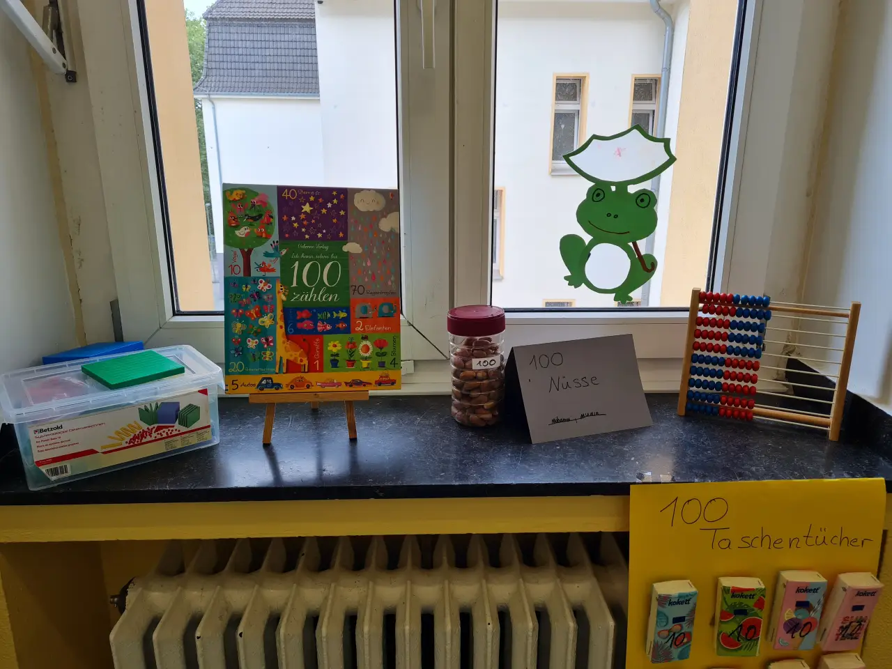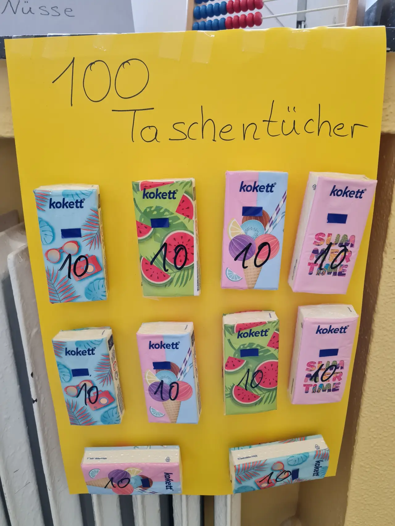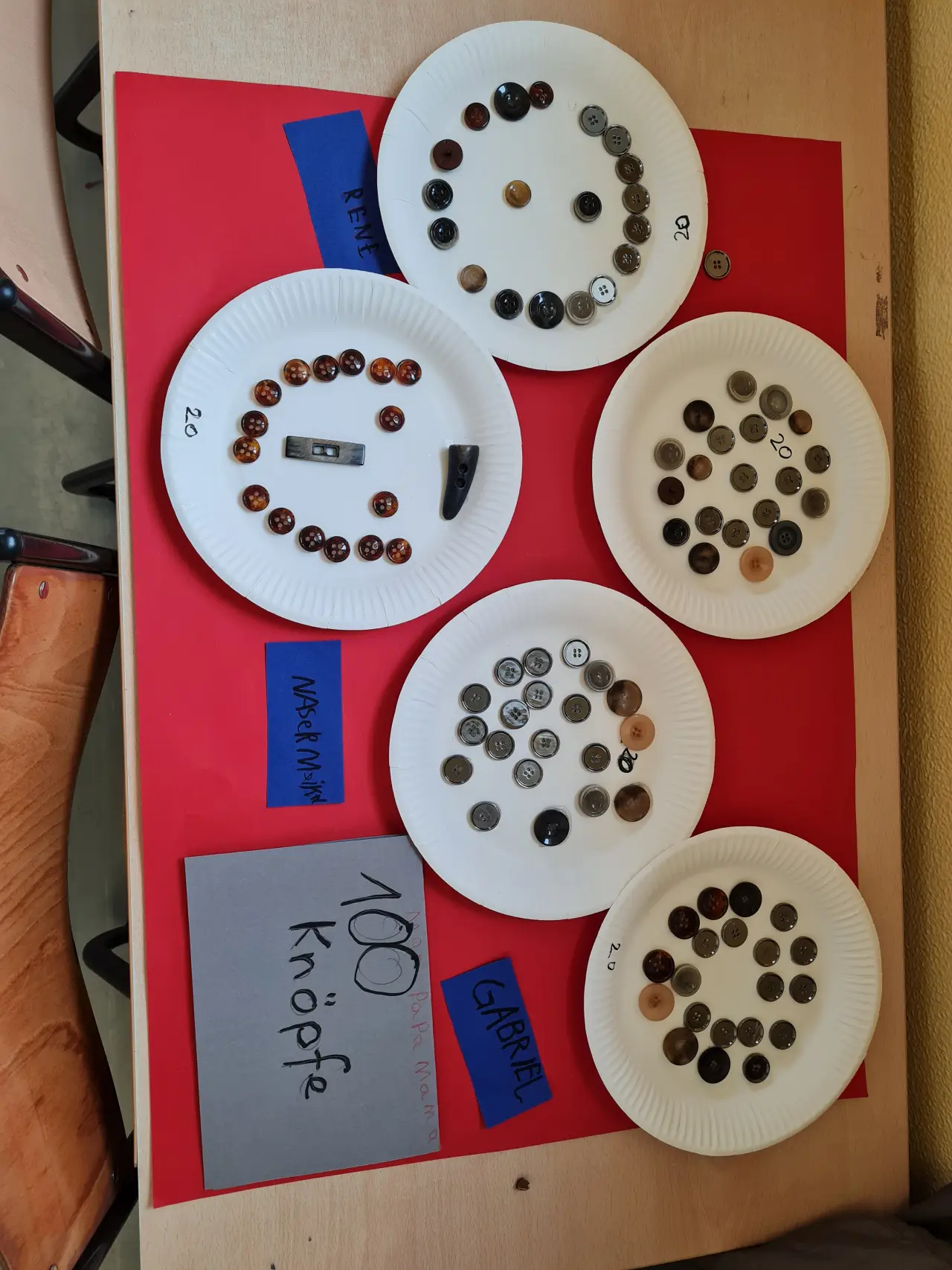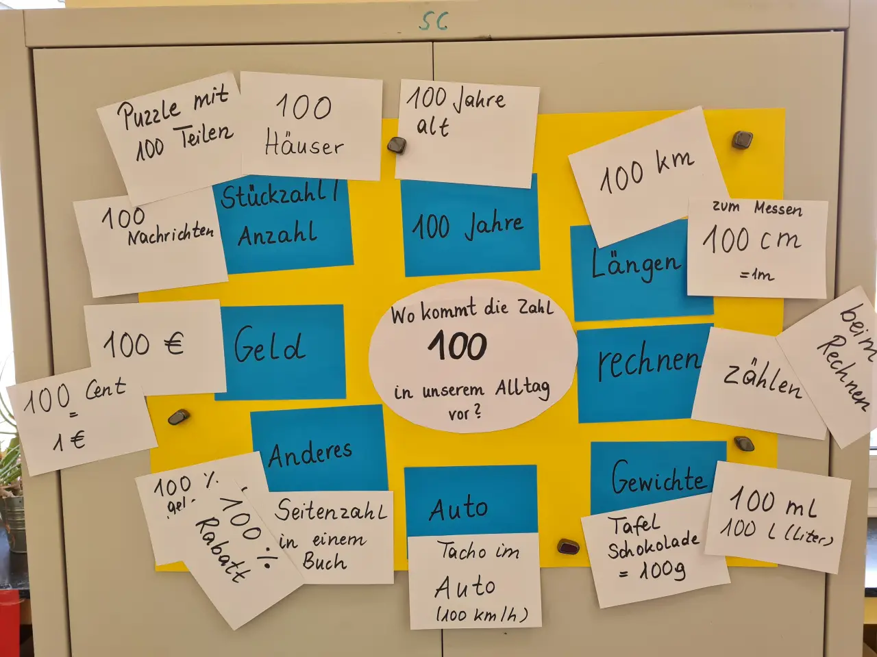 Es wurden eine Klassen-Mindmap zur Zahl 100 erstellt und in Partner- und Gruppenarbeit Plakate und weitere Exponate für die Hunderterausstellung gestaltet. Dabei wurde besonderes Augenmerk auf die Zehnerbündelung gelegt.
