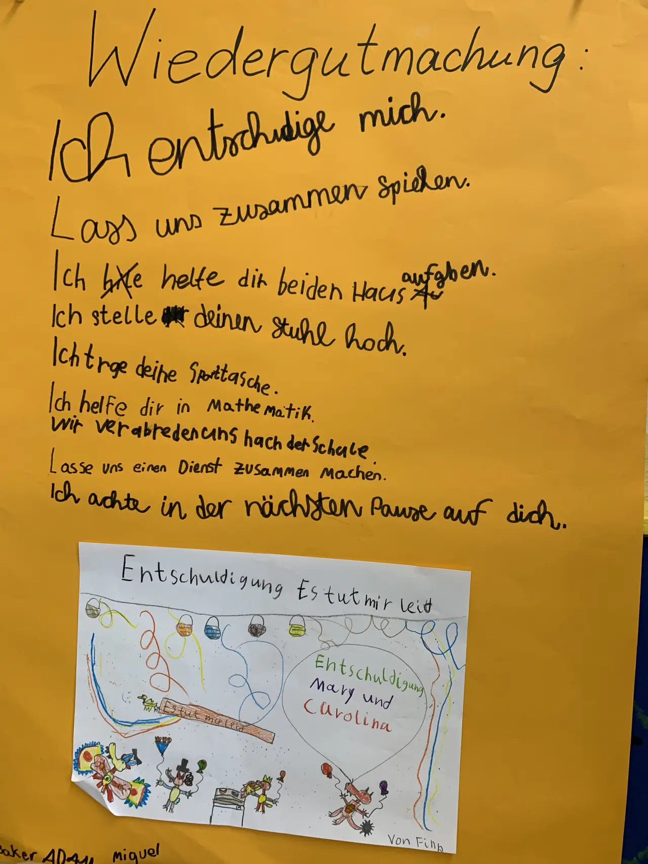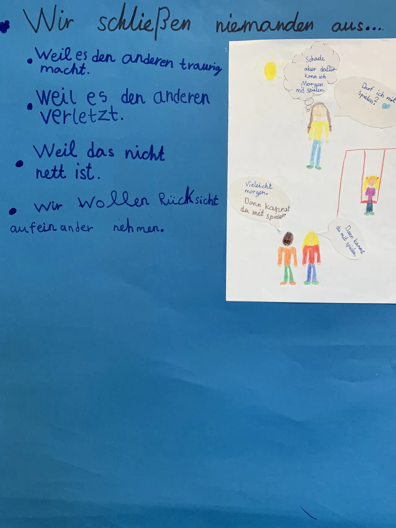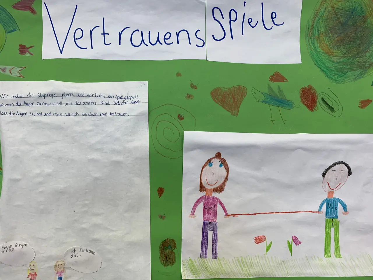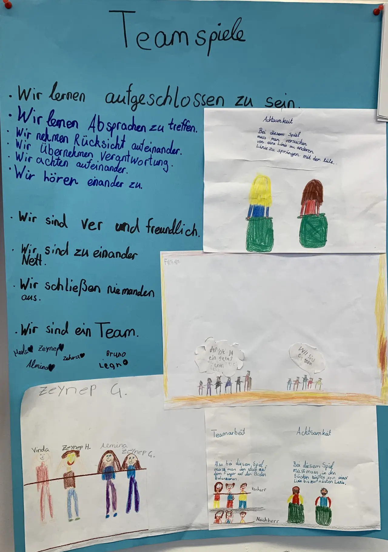 Die Kinder haben auf Plakaten die wichtigsten Regeln und Vereinbarungen sowie Trainingsmöglichkeiten festgehalten. In regelmäßigen Abständen werden diese im Unterricht besprochen und somit stetig erinnert. In Konfliktsituationen dienen sie als roter Faden zur Lösung eines Konfliktes.